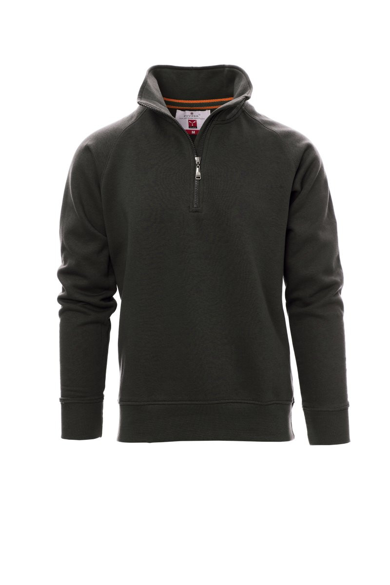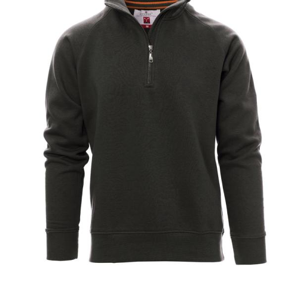 Felpa in tessuto garzato 70% cotone e 30% poliestere, gr.300/mq., con zip in tinta. Modello con manica raglan, polsini e vita in costina elasticizzata e cuciture rinforzate per una maggiore durata.